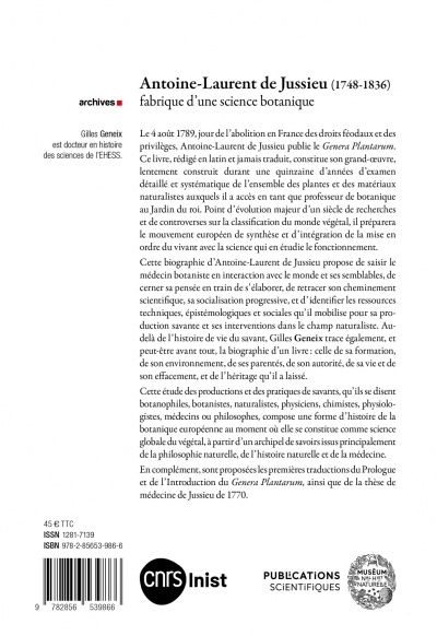 This biography of Antoine-Laurent de Jussieu seeks to portray the botanist physician in interaction with his colleagues and the world, to follow the development of his thought, to retrace the progression of his scientific approach, his ongoing socialization, as well as to identify the technical, epistemological and social resources that he mobilized for his scholarly output and his interventions in the field of natural history. Beyond the life story of the scholar, Gilles Geneix above all traces the biography of a book, the Genera Plantarum: its construction, genealogy, global environment, authority, its intellectual life and erasure and, finally, its lasting legacy.