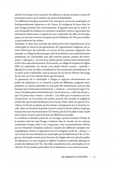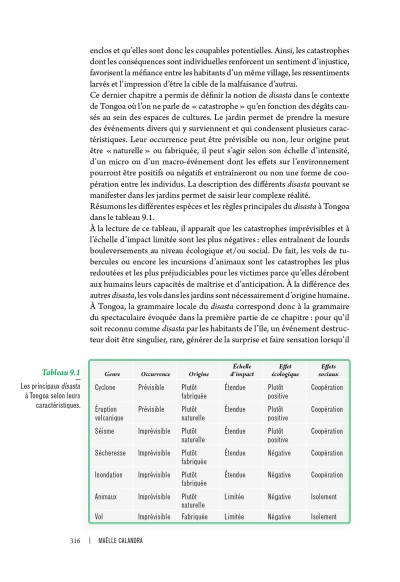 This book focuses on the subsistence gardens of Tongoa, an island located in the central Vanuatu archipelago (South Pacific), and explores everyday life in an environment shaped by recurrent catastrophe. Drawing on an ethnographic approach at the intersection of the anthropology of nature and the anthropology of disasters, it seeks to highlight the relationships the relationships that inhabitants have with each other, with their gardens, and with the collectives of non-humans that inhabit their territories. Tongoa’s environment is marked by disaster, which constitutes an inescapable condition of existence. Cultivated gardens are regularly disrupted, and at times temporarily destroyed, by large-scale seismic or climatic events —such as Cyclone Pam in March 2015. Examining the various phenomena encompassed by the local category of disasta reveals how catastrophe is conceptualized and why it enables the continual reinvention of the social.