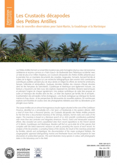 The Lesser Antilles are an almost homogeneous insular region situated at the core of the ­Caribbean Province, identified as a remarkably rich « Hot Spot » of biodiversity in the western Atlantic. With a total of more than a thousand species, Les Crustacés décapodes des Petites ­Antilles presents for the first time a documented inventory of the shrimps, lobsters, hermit crabs and crabs of the ­region. This inventory is based on a literature search of ca. 600 scientific contributions published over more than two centuries and integrates American, French, Dutch and Venezuelan research efforts. Also included are some unpublished data from recent expeditions to the French islands of St Martin, Guadeloupe and Martinique. Readers will find an up-to-date list of the species that ­complies with the latest taxonomic revisions as well as providing the source of each record. An analysis of the list provides: a sampling history of the islands, the result of the inventory ­presented by families, islands and archipelagos, the documentation of the major ecological habitats, the ­zoogeographic appraisal distinguishing marine and freshwater fauna and the prospects for new discoveries of undescribed species. This work illustrates many species in colour, with photographs taken in the laboratory and in the field.