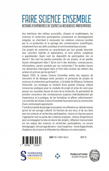 Turcati L. & Villarroel Parada A. (sous la dir.) 2025 — Faire Science Ensemble : retours d’expériences de sciences & recherches participatives. Paris : Muséum national d’Histoire naturelle ; Sorbonne Université Presses, 477 p.